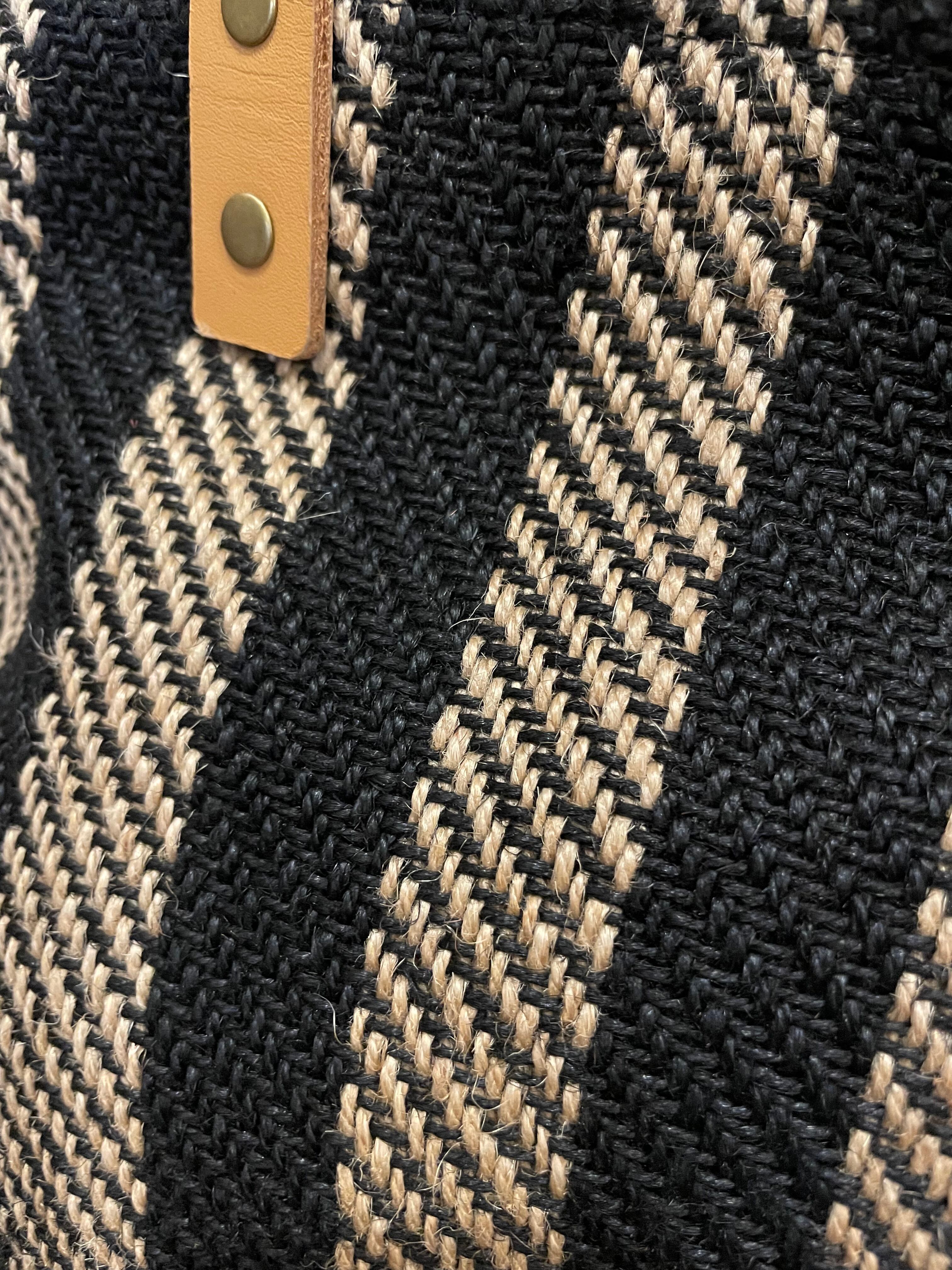 ジュート麻のモノトーンのストライプとレザーハンドルがシックなデザイン。