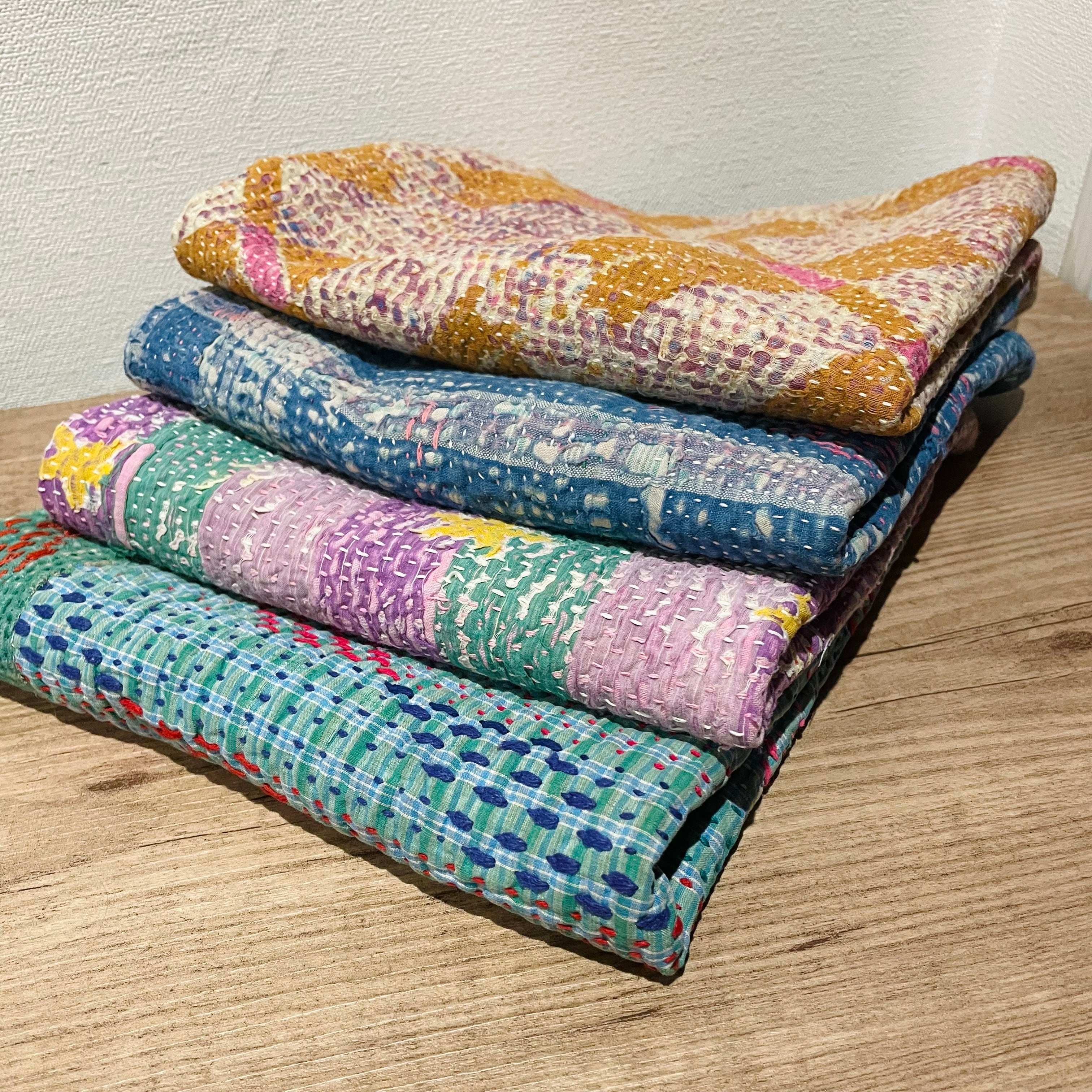 使い古されたサリーやドゥパタを重ね、伝統的な刺し子技法で仕上げられています。