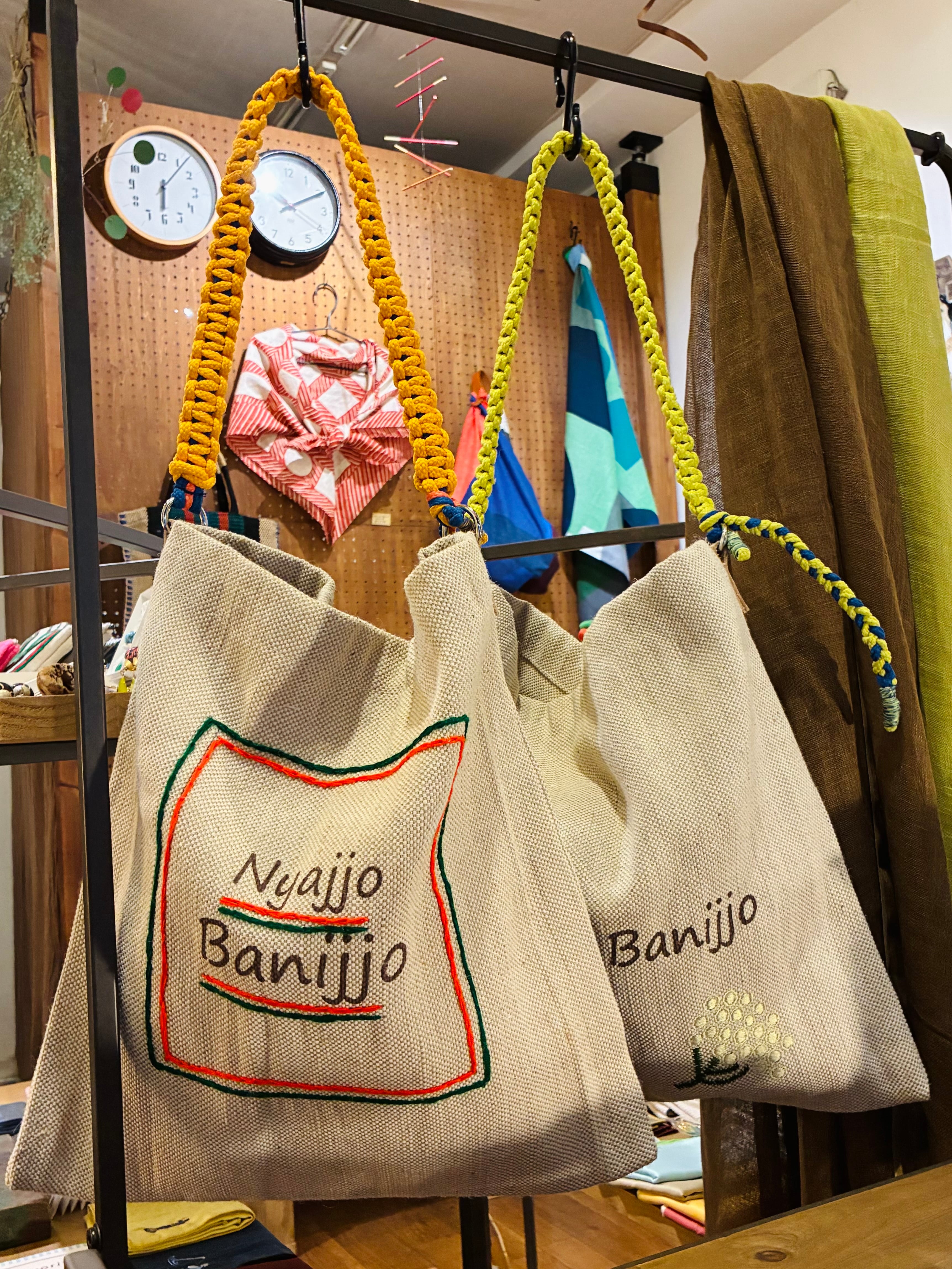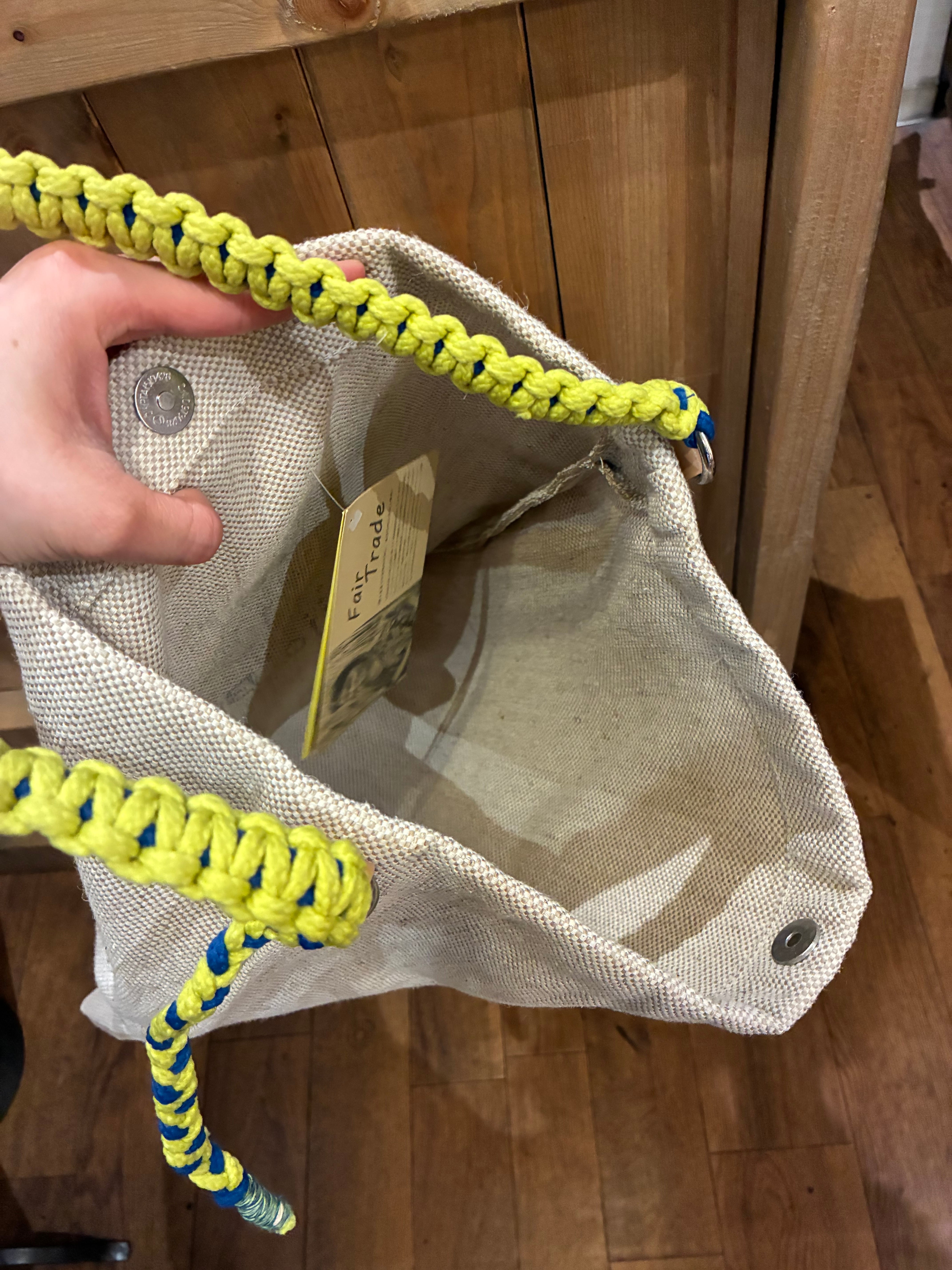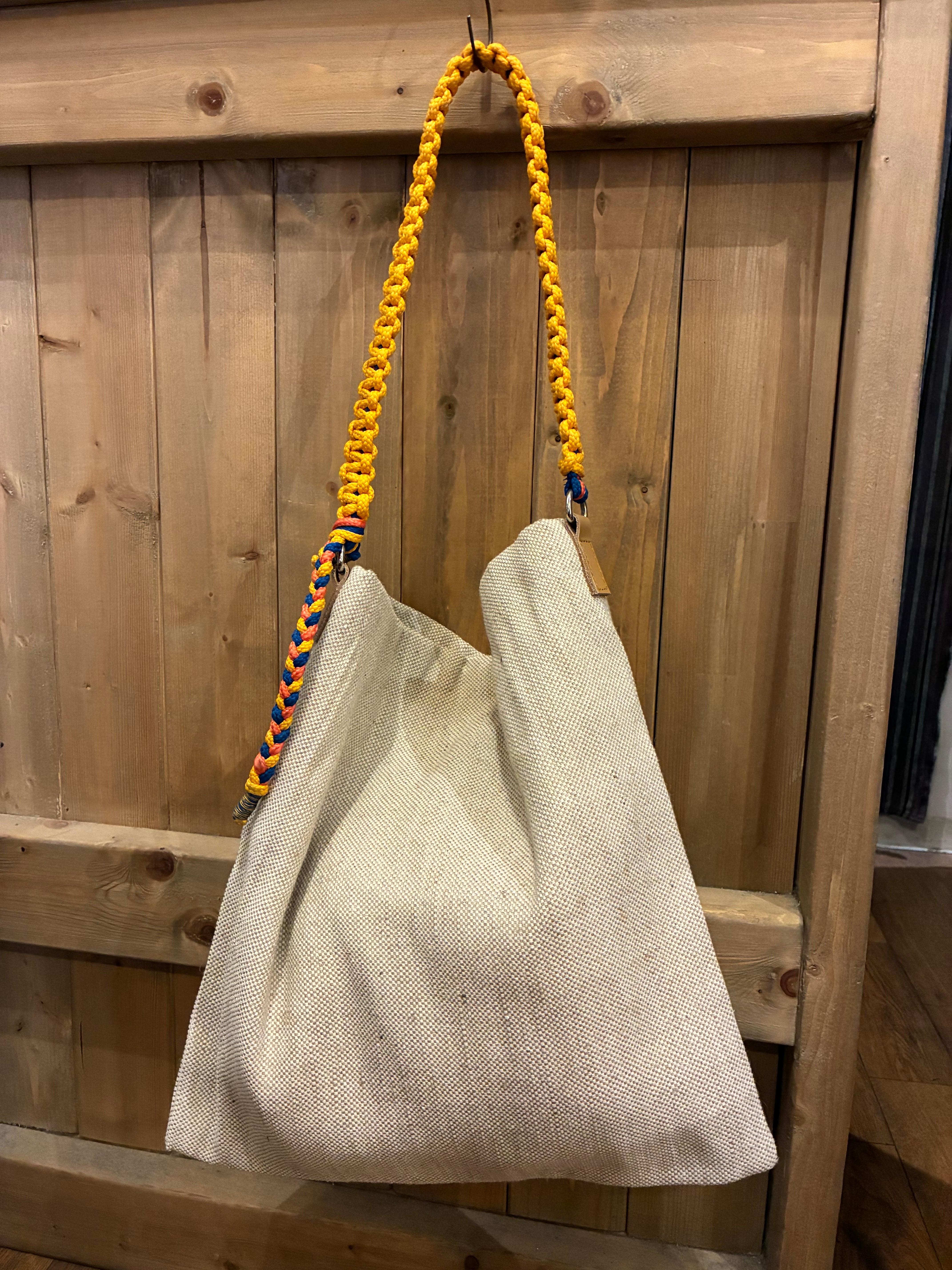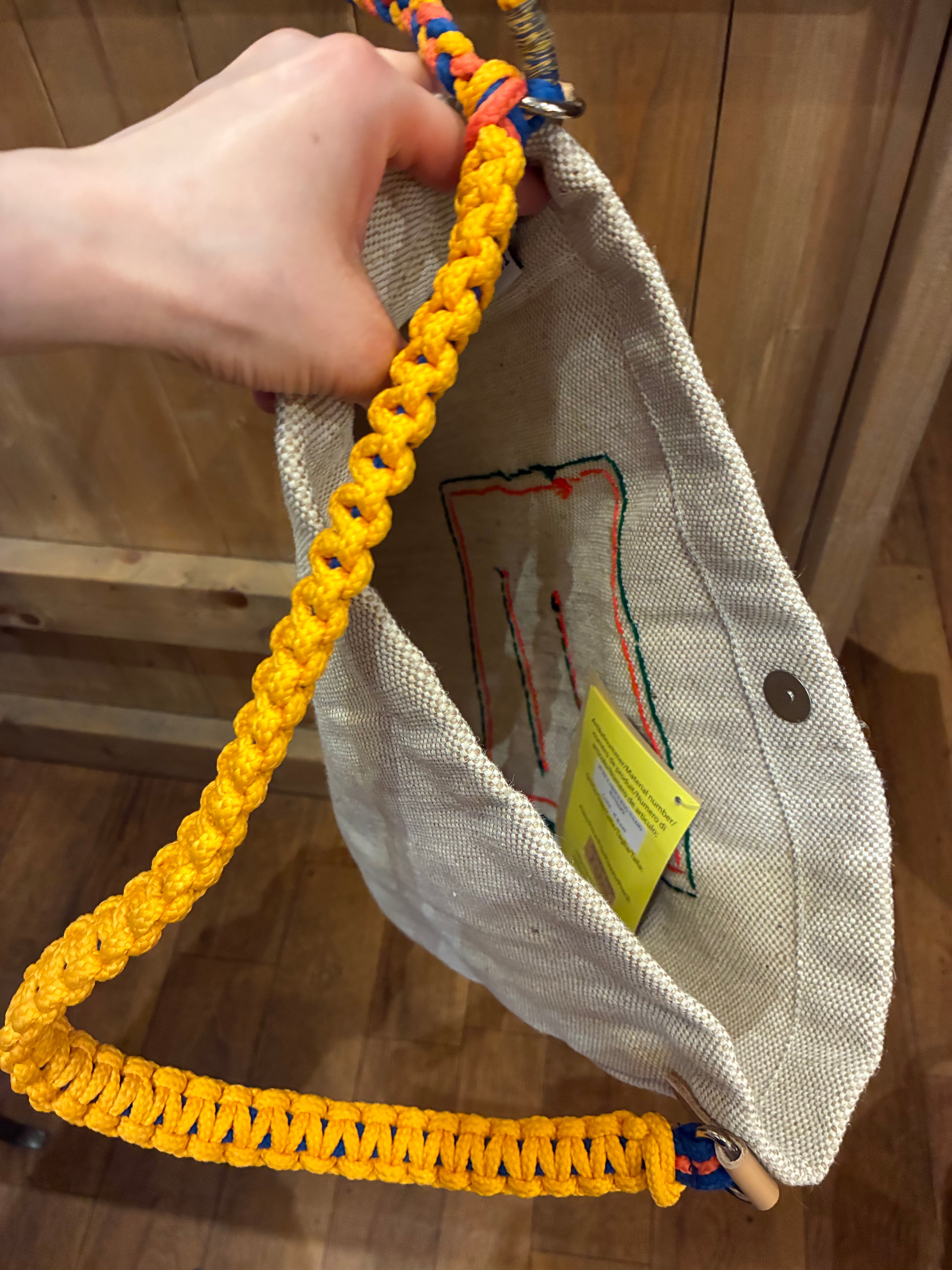 カラフルなコード編みのハンドルがポイントになるジュートバッグ。