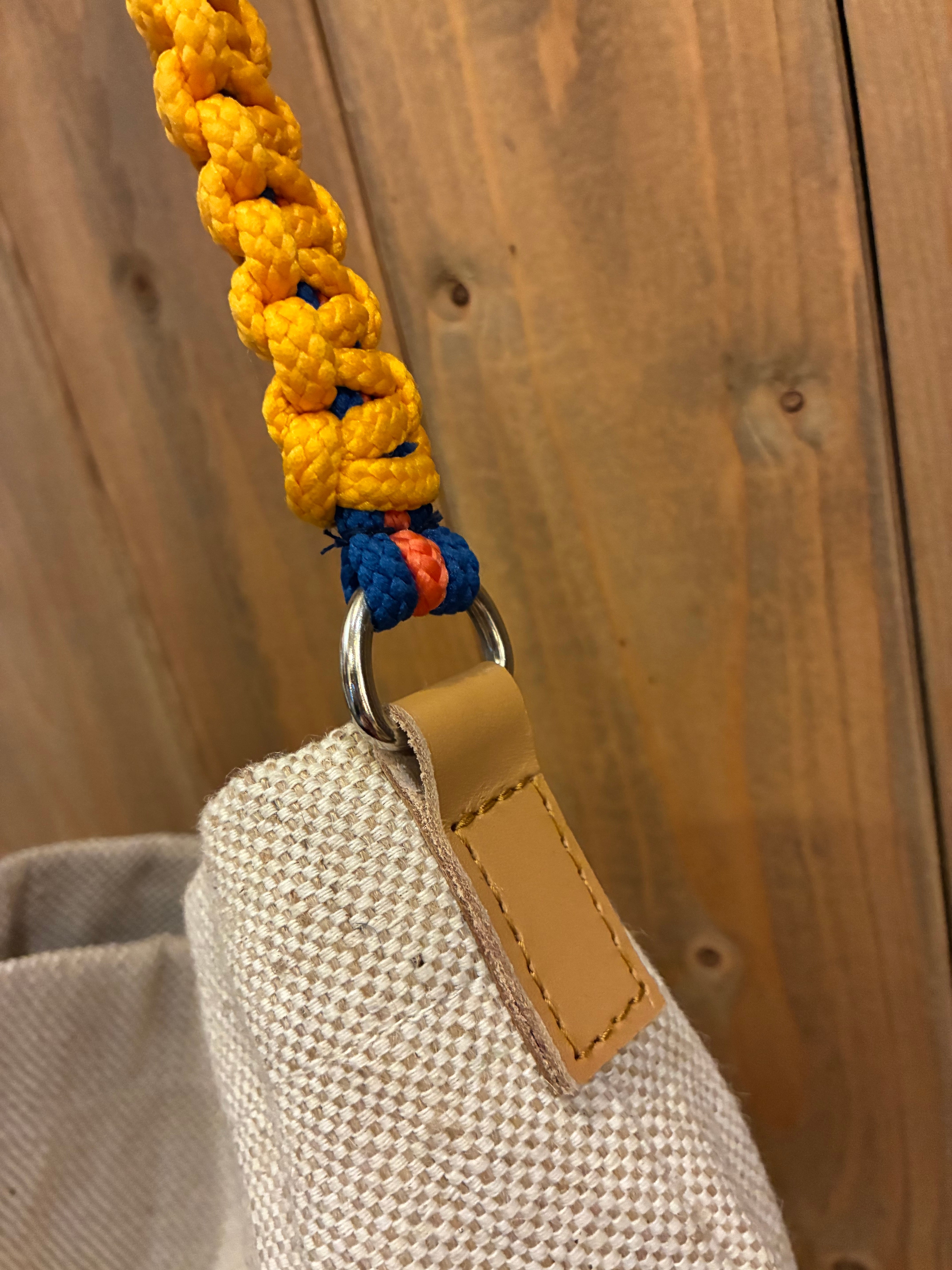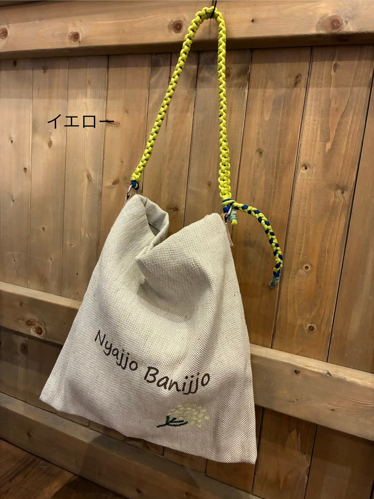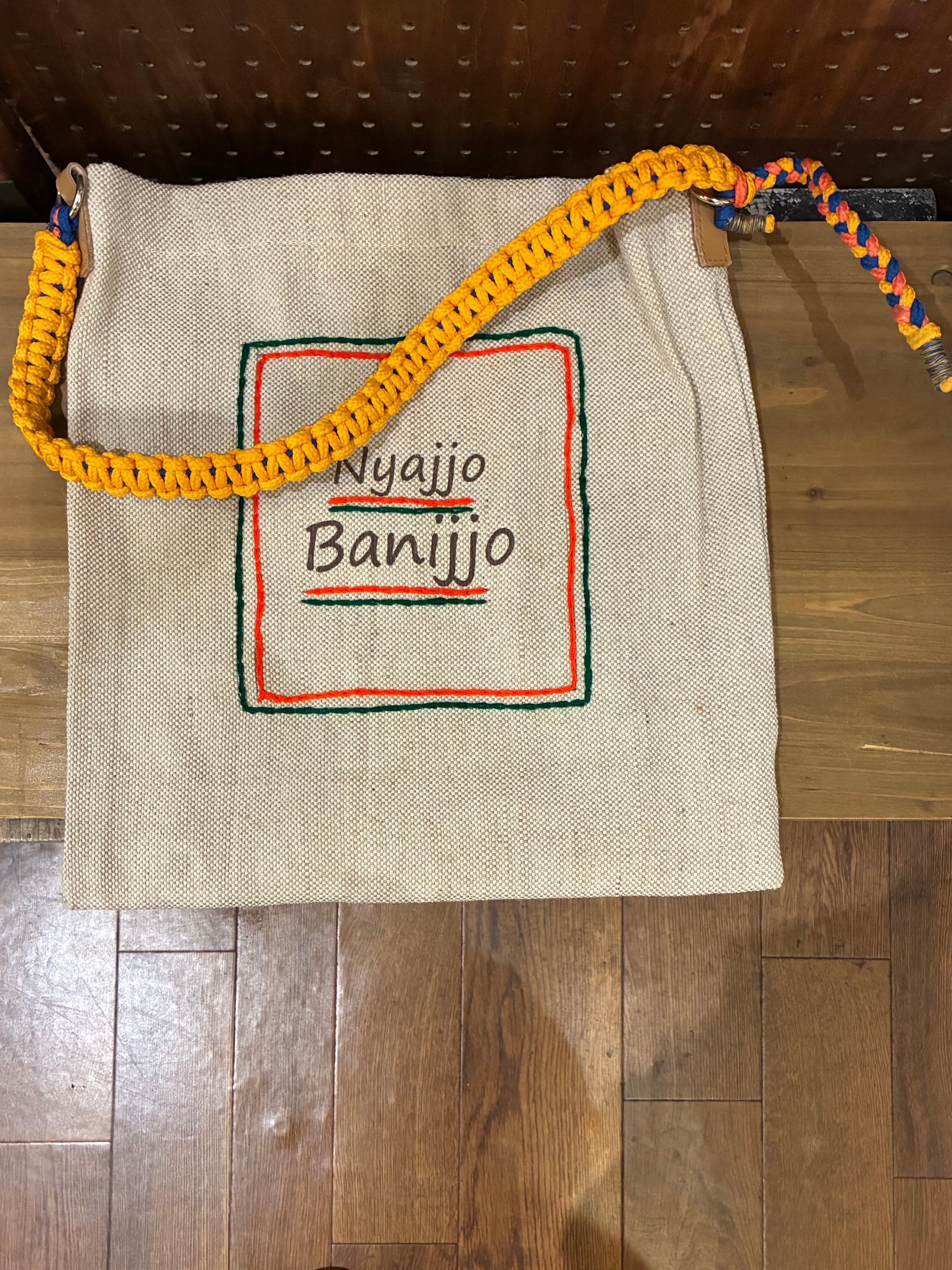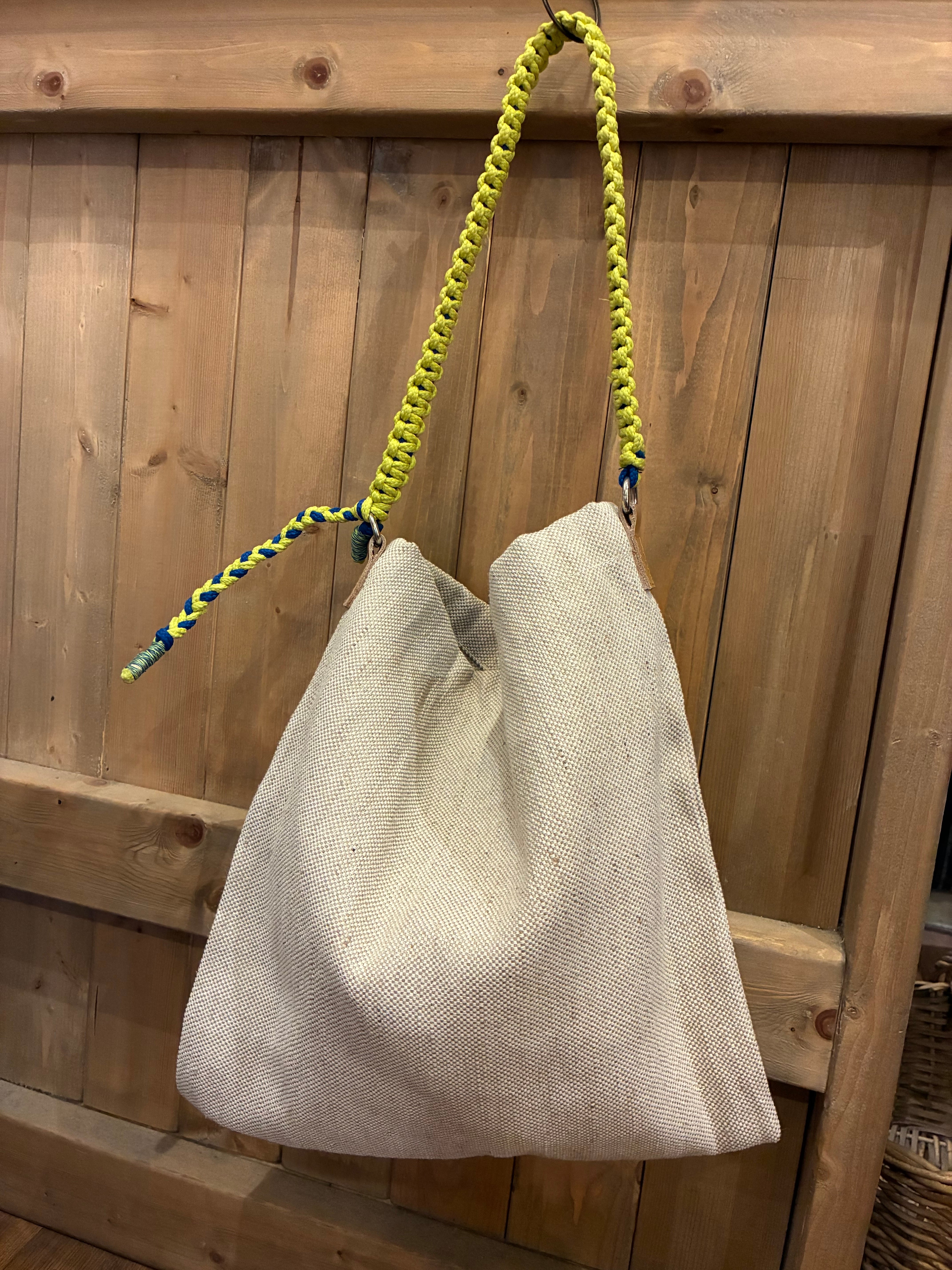 カラフルなコード編みのハンドルがポイントになるジュートバッグ。
